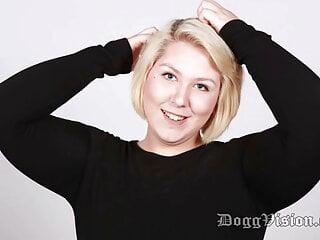 Die 18 jährige füllige Blondine macht die Beine breit für den schwarzen Fotografen